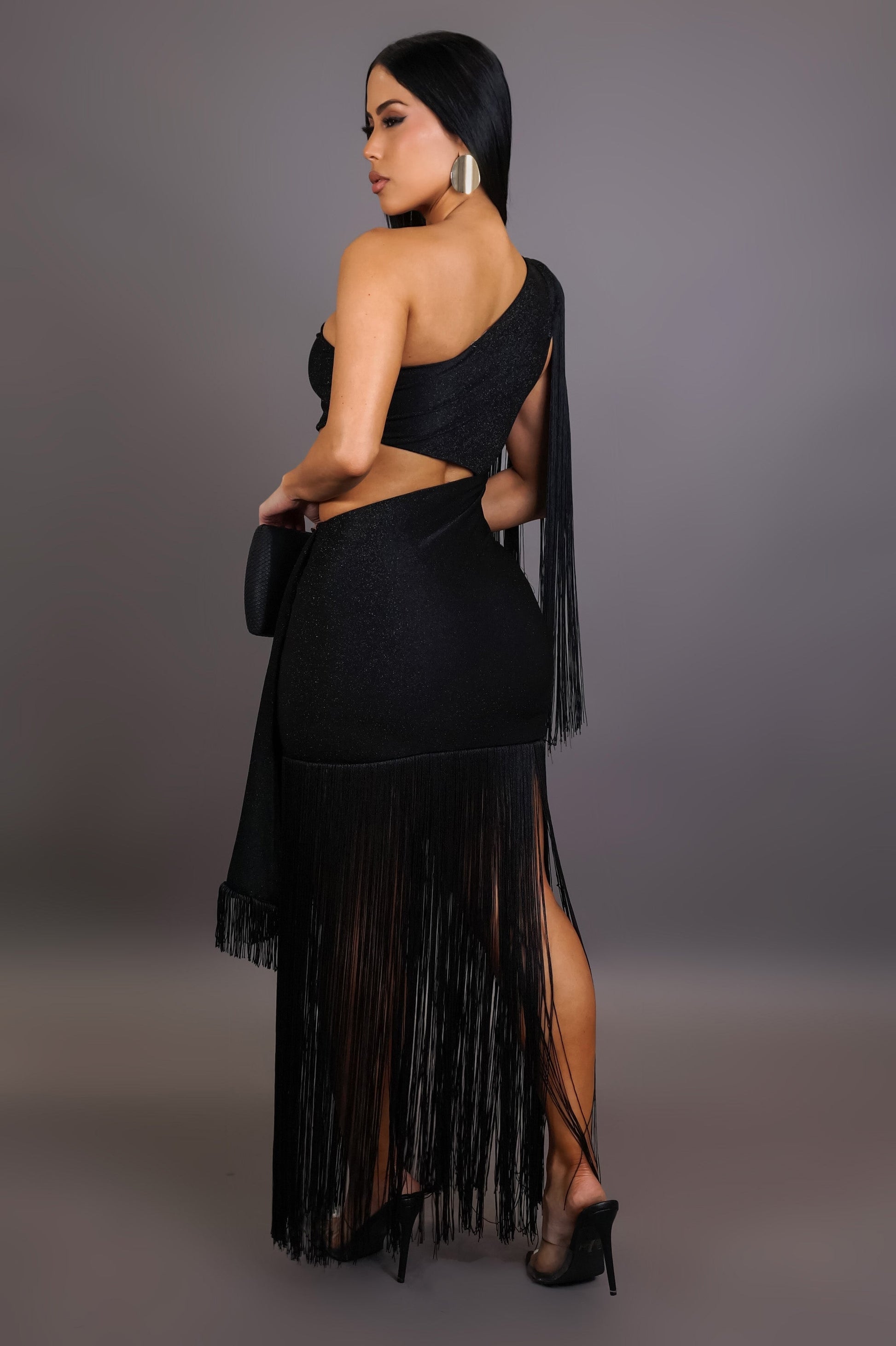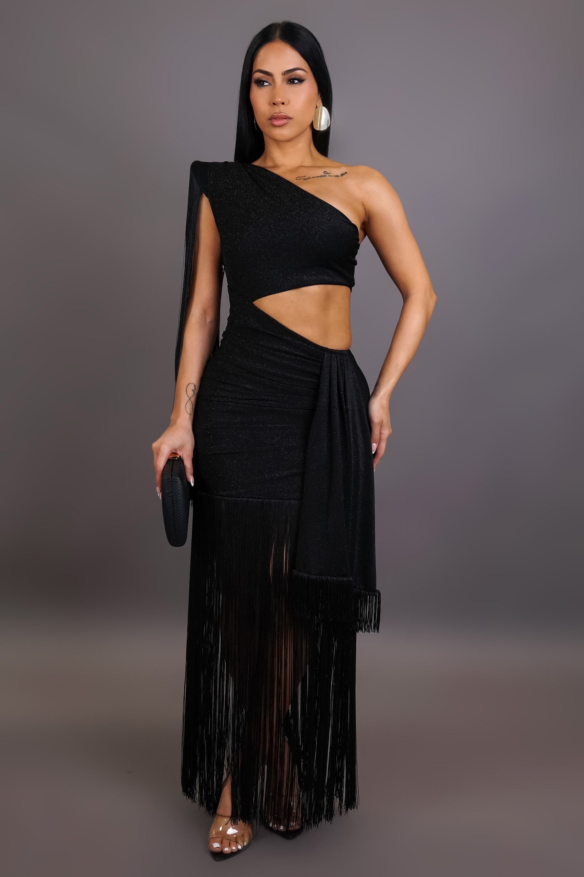 This dress is a striking blend of contrasting textures and flowing fringe that captures both boldness and grace. With its asymmetrical draping and long, sleek tassels, this gown offers a dynamic silhouette that sways with every movement. The shimmering fabric adds a touch of celestial allure, making it perfect for those who want to stand out with a sophisticated yet playful flair. Whether for a red-carpet event or an unforgettable evening, this dress radiates confidence and captivating charm.
