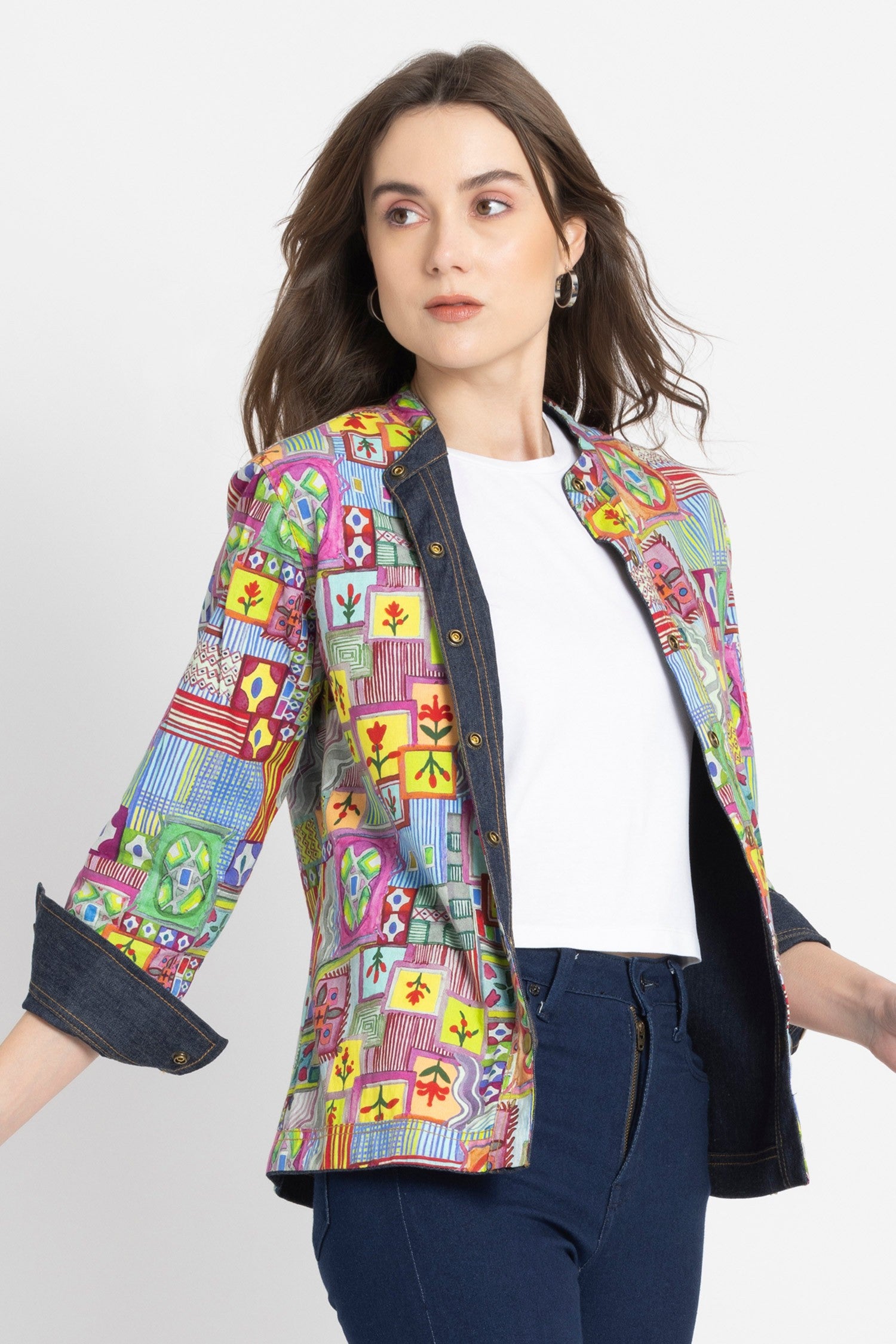 Picture yourself slipping into this jacket, feeling the sturdy yet soft denim embrace you in comfort. On one side, revel in the timeless appeal of classic denim, complete with two flap pockets at the front for a touch of practicality. Flip it over, and you'll discover a bold printed design that adds a splash of personality to your ensemble.