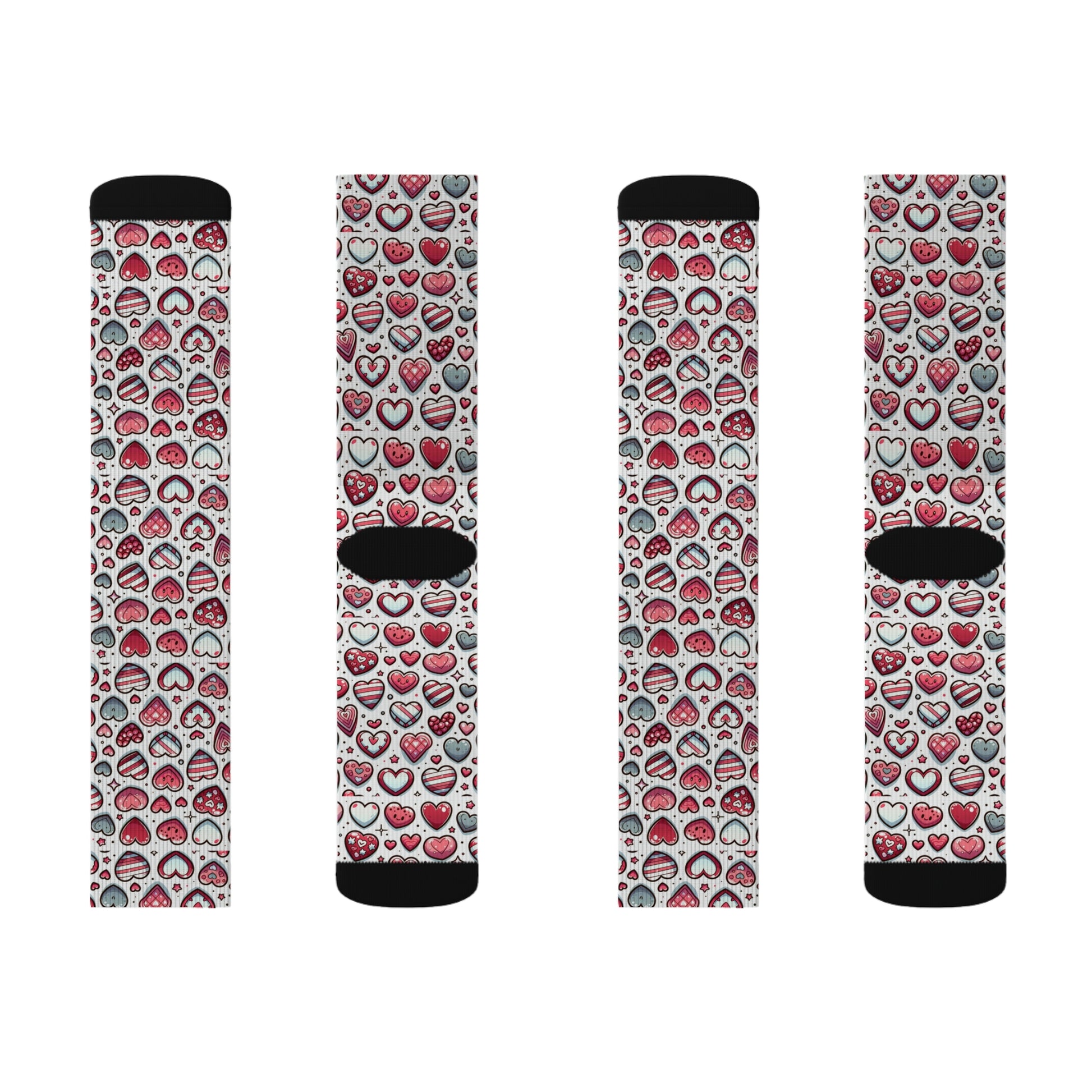 These sublimation socks feature adorable Valentines hearts all over, perfect for spreading love and warmth. With super soft fleece lining, crew length, and cushioned bottoms, these socks provide excellent protection and coziness. Ideal for anyone looking to celebrate Valentine's Day or simply add a touch of love to their outfit.
