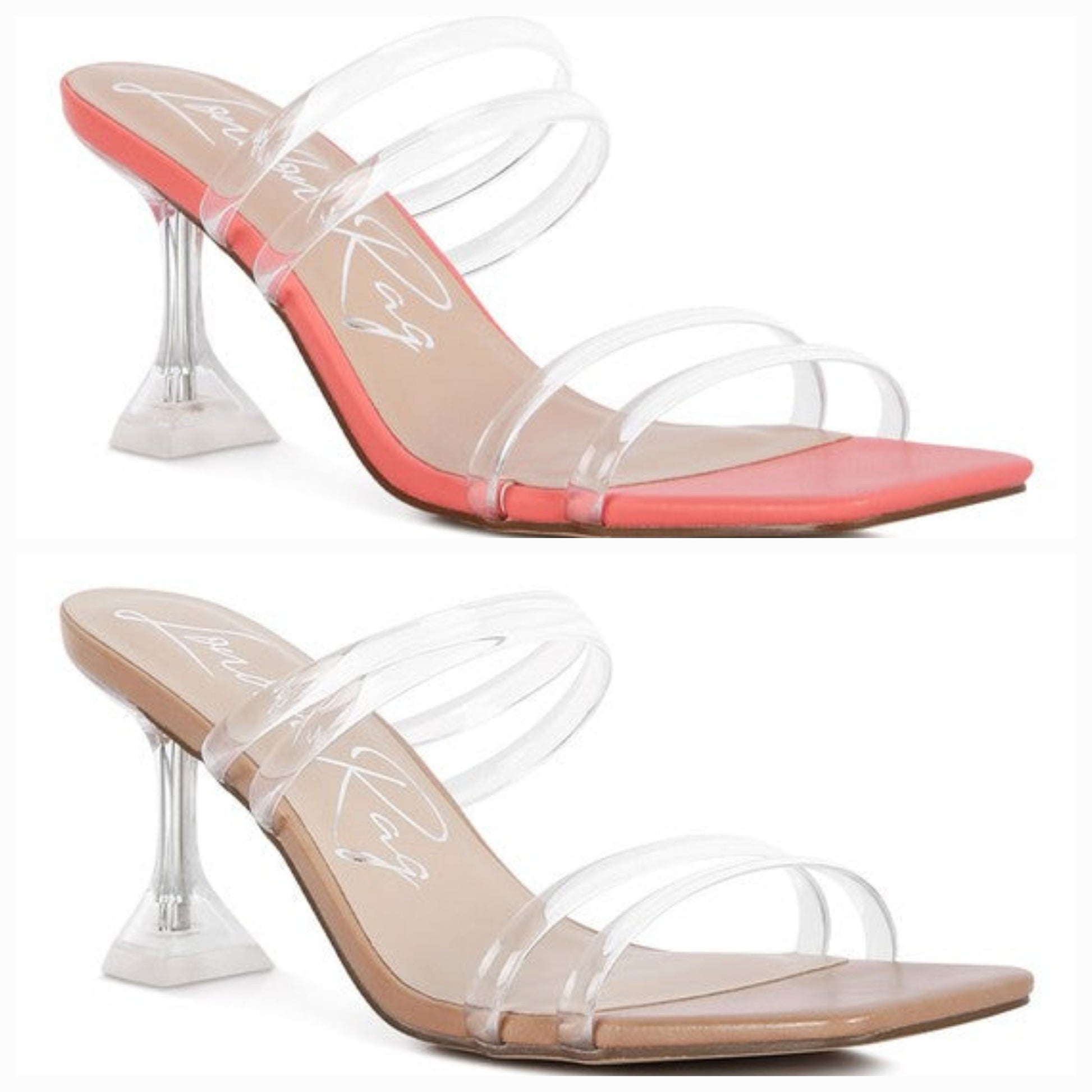 Mid heel casual party sandals with lightly padded insole has clear rounded tube straps and heel. The shoe looks beautiful on feet and has a comfortable height