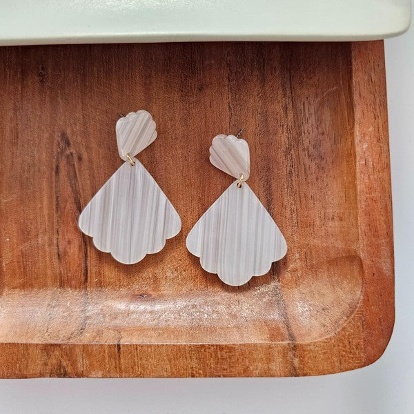 Make a splash with our Ariel earrings! Inspired by seashells, these scalloped acrylic earrings are a stunning addition to any outfit.. Perfect for a day at the beach or a night out on the town, these earrings are sure to catch some attention and make you feel 'spe-shell'.