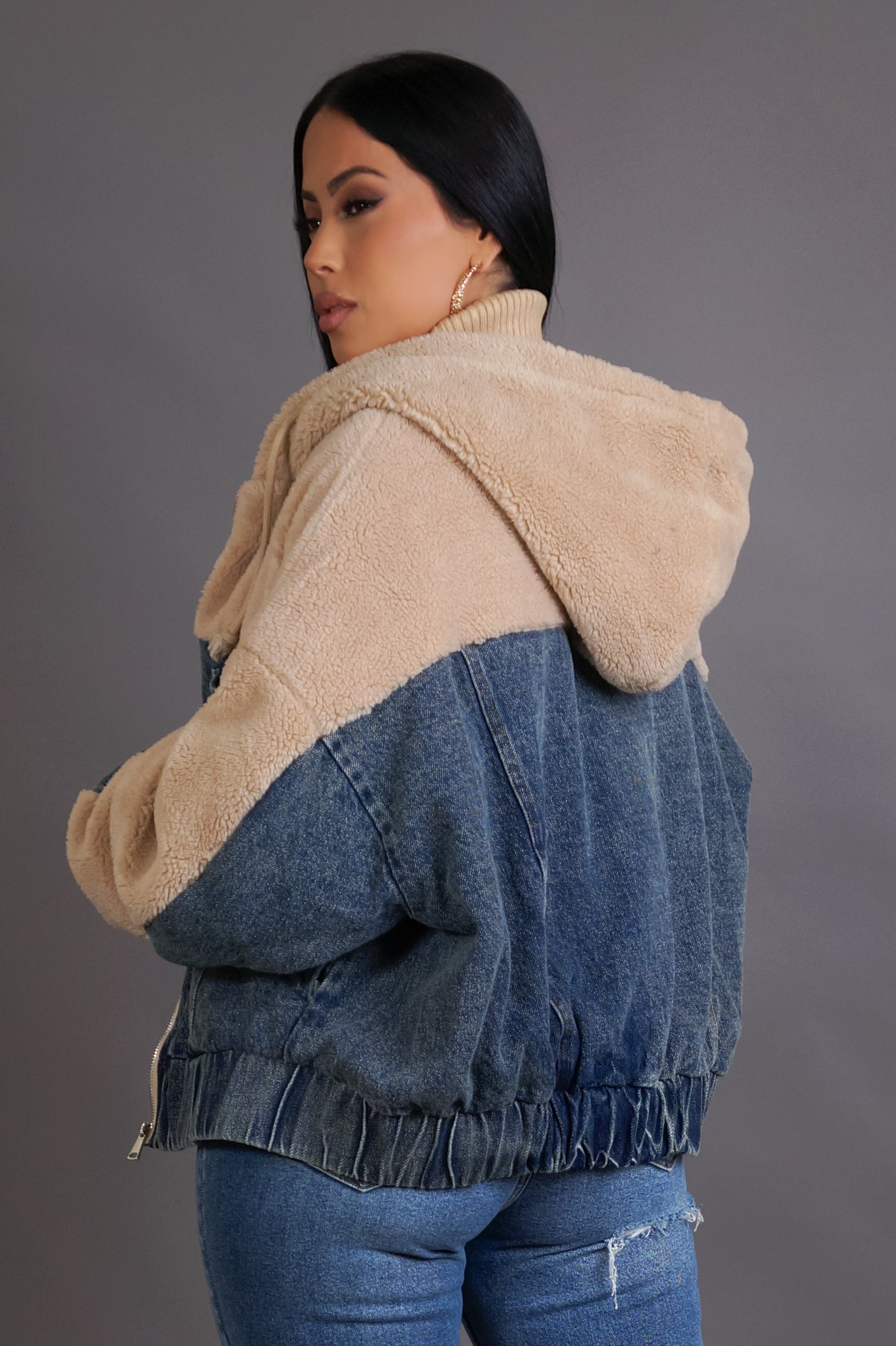This Jacket Showcases A Unique Combination Of Teddy Fur And Washed Denim Composition, Shaping A Drawstring Hood, Drop Shoulders And Long Balloon Sleeves. The Relaxed Zip-Front Bodice Boasts Elasticized Cuffs And Hem, Finished With Front Patch Pockets.
