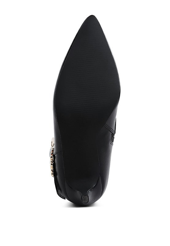 These edgy, pointed-toed boots are crafted from durable faux leather, with a bold double buckle detail, enhancing the look feel. With a sleek stiletto heel and plush cushion insole, they promise exceptional comfort and a relaxed fit, making them ready for everyday fun and adventurous weekends.