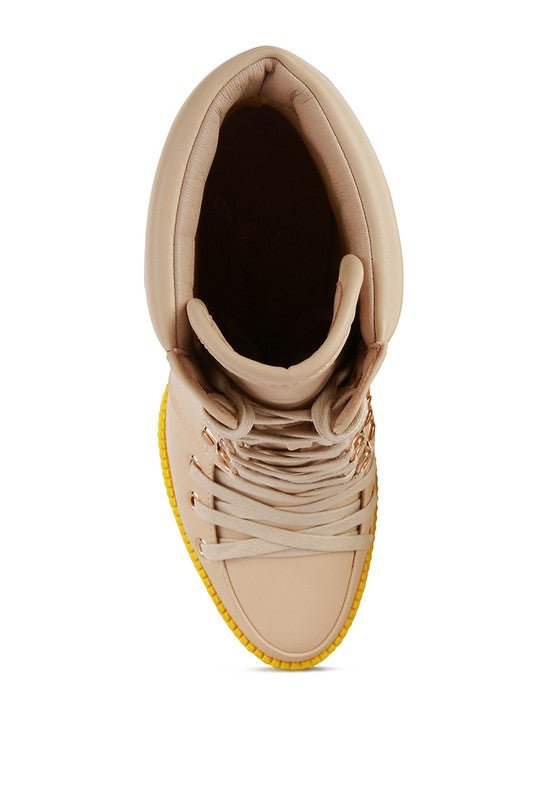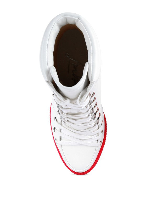 Contrast color highlight Cushion Collared White Ankle Boot with lace-up detail. The colored lug sole platform adds to the look. It has a pointed closed toe which makes it look sharp. The buckle shows at the back make it chic!