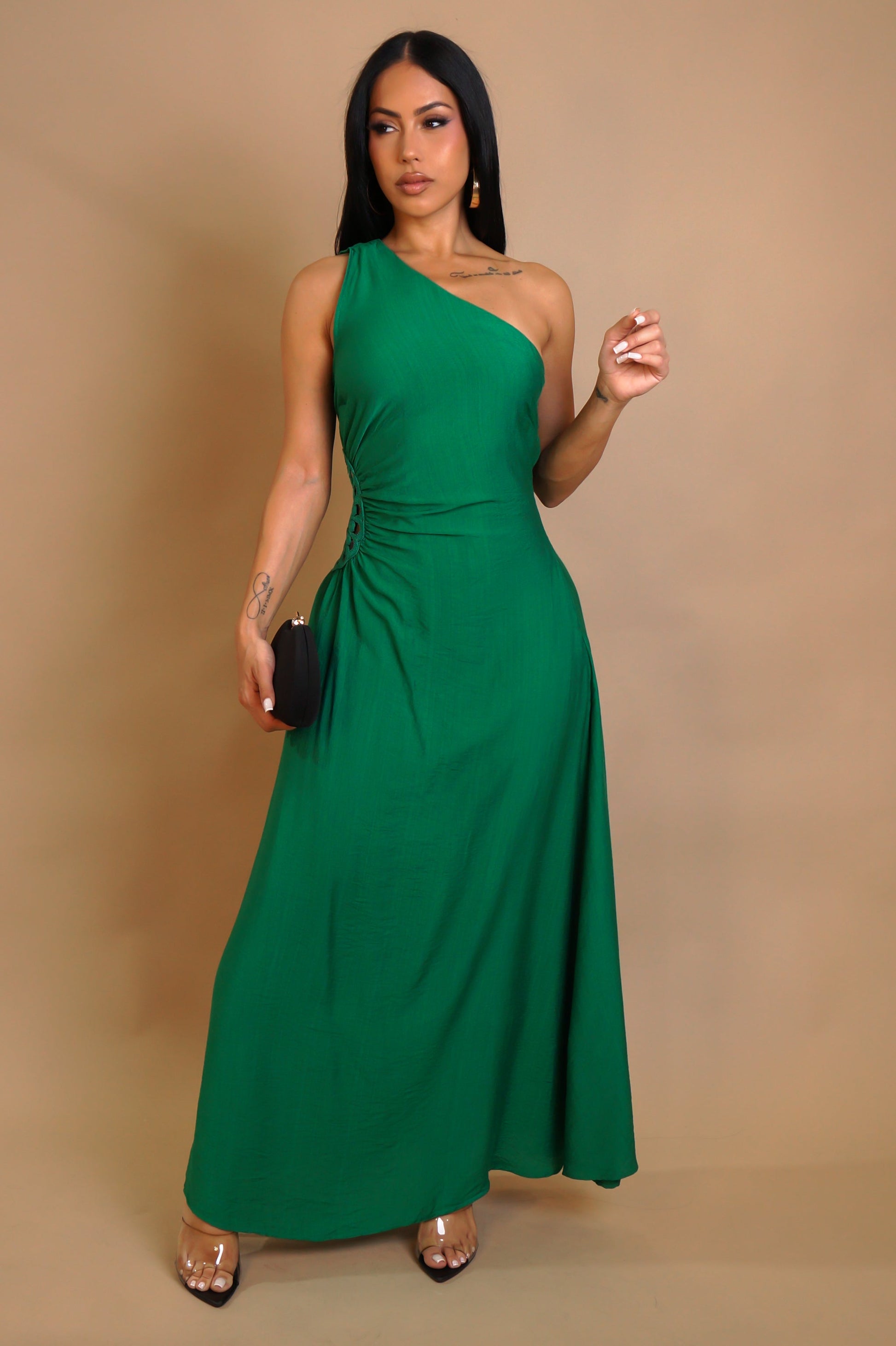 This elegant one-shoulder silhouette flows with ease and features an intricate circular crochet accent at the side waist, creating soft gathers and a refined sculpted look. Designed for graceful movement, this piece blends timeless elegance with artisan detail — ideal for events, brunches, or sunset dinners.