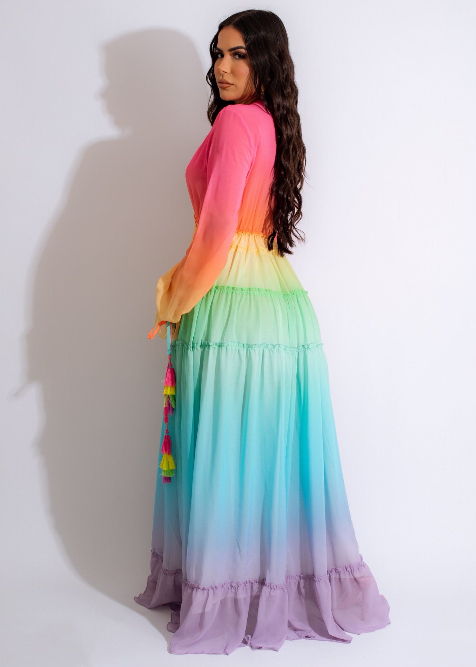 Pastel ombre tiered chiffon maxi dress.