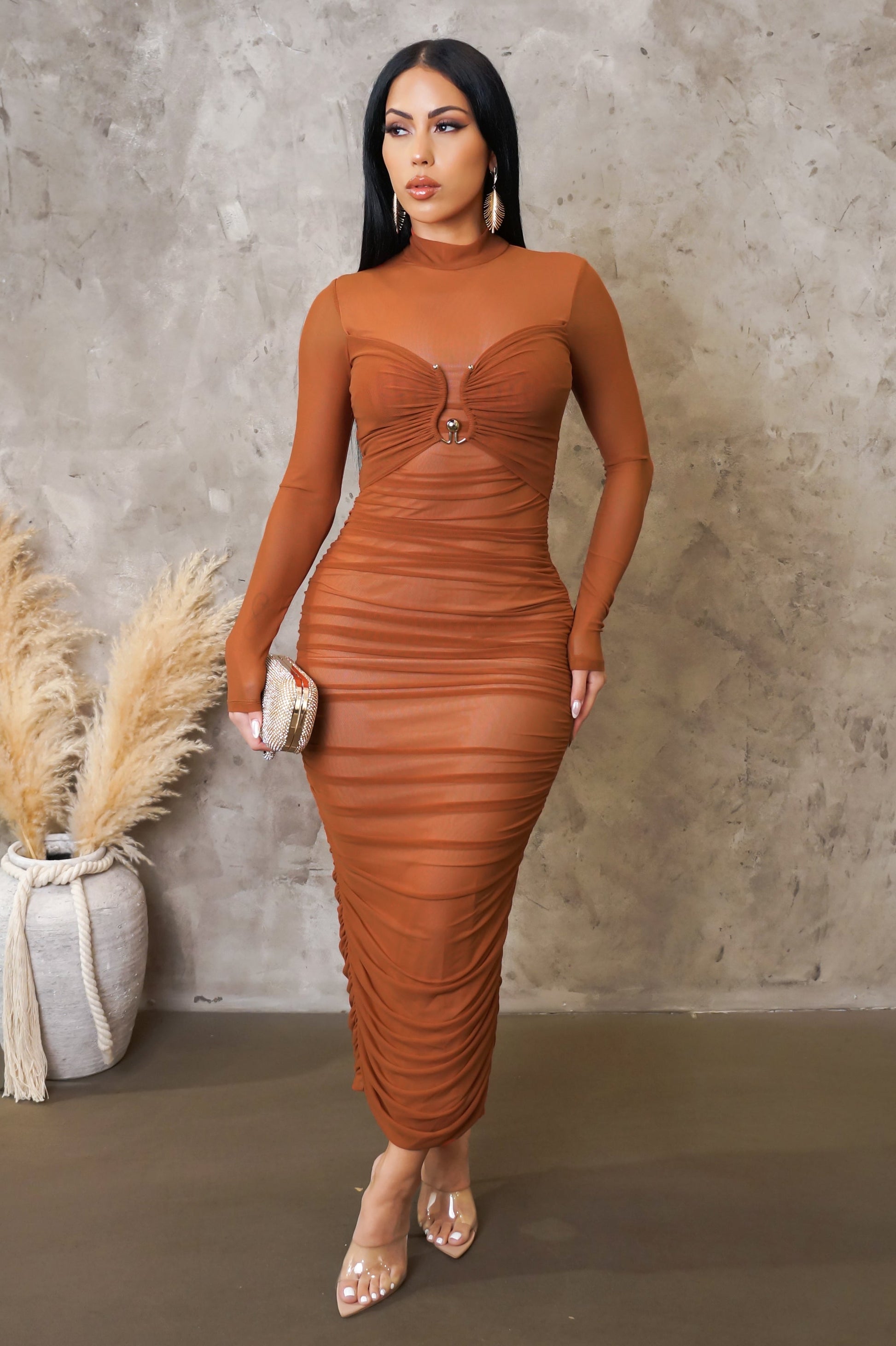 Long sleeve mesh ruched dress featuring gold metal bust detail