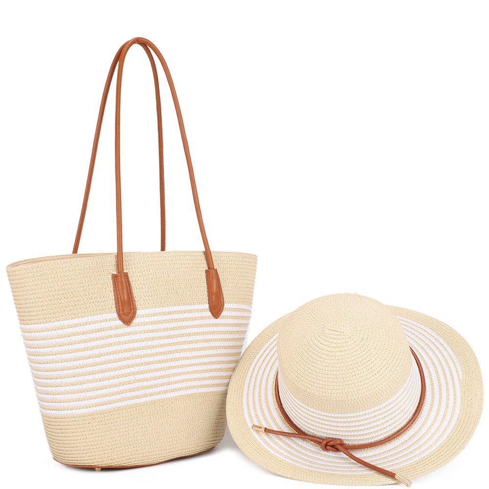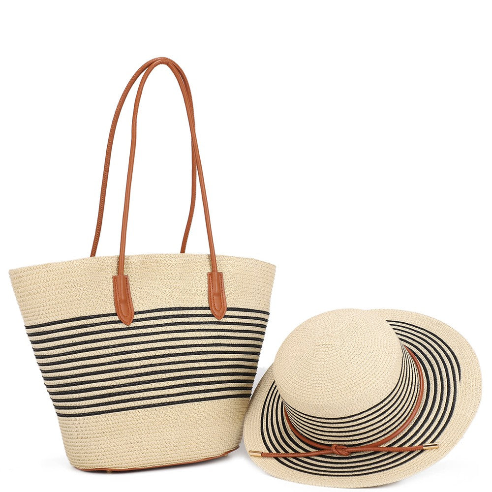 2In1 Stripe Straw Tote Bag W Sun Hat Set