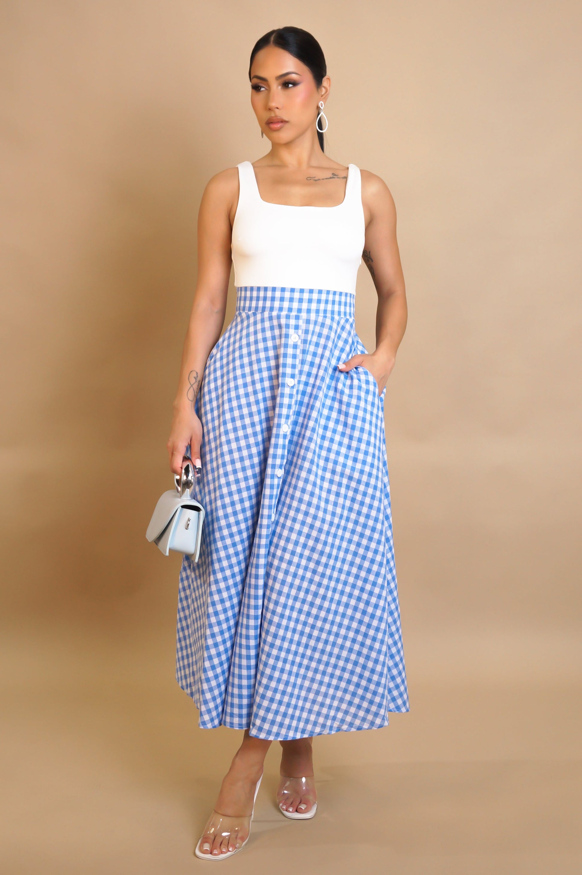 Vintage Look White & Plaid Flare Midi Dress- Red or Blue