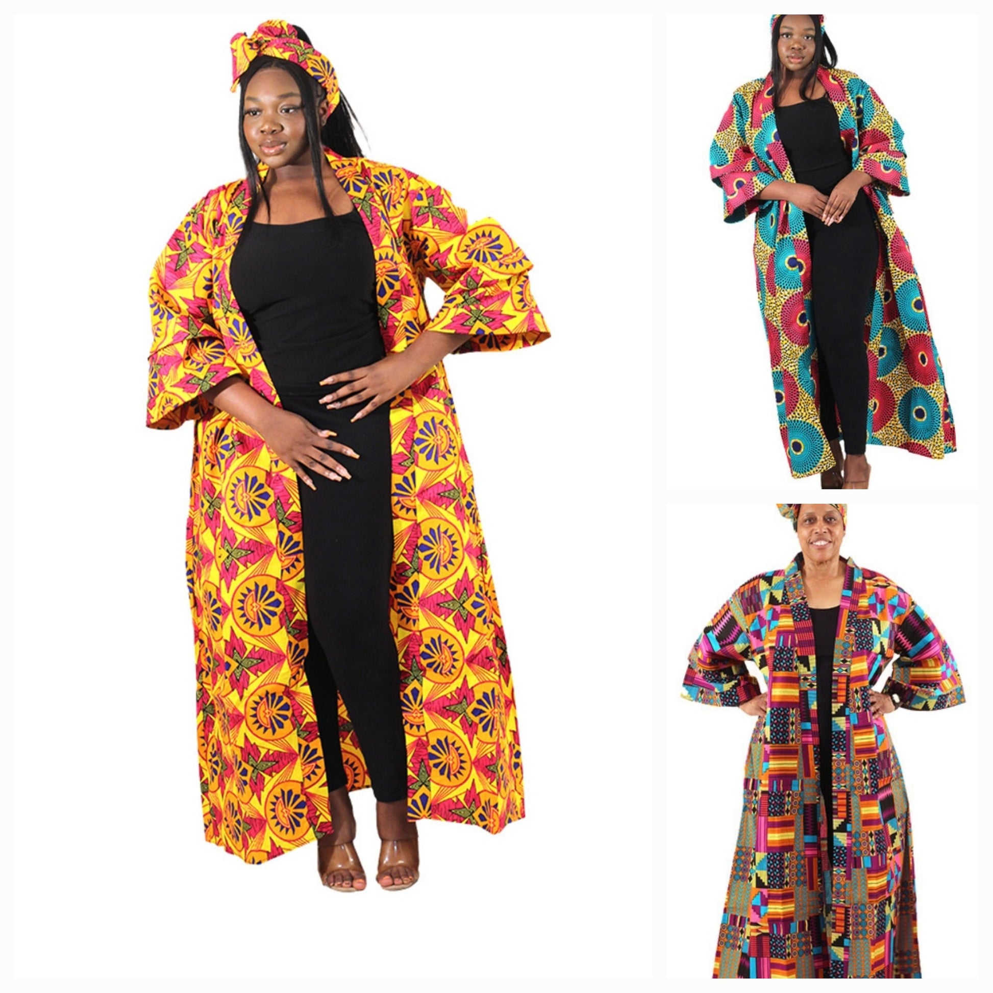 Blend comfort and style with this African Print Long Kimono. This casual, cosy piece comes in a variety of fun prints you'll love wearing again and again. It has an open front, ¾ sleeves, and a matching head wrap. This long kimono hits around the ankle for full body coverage. The over-sized, loose fit makes it comfortable to wear all day long. It is great for spending time with friends, running errands, or lounging around the house. Get comfortable in style with this African print kimono. 100% Cotton. Made in India. C-WK351