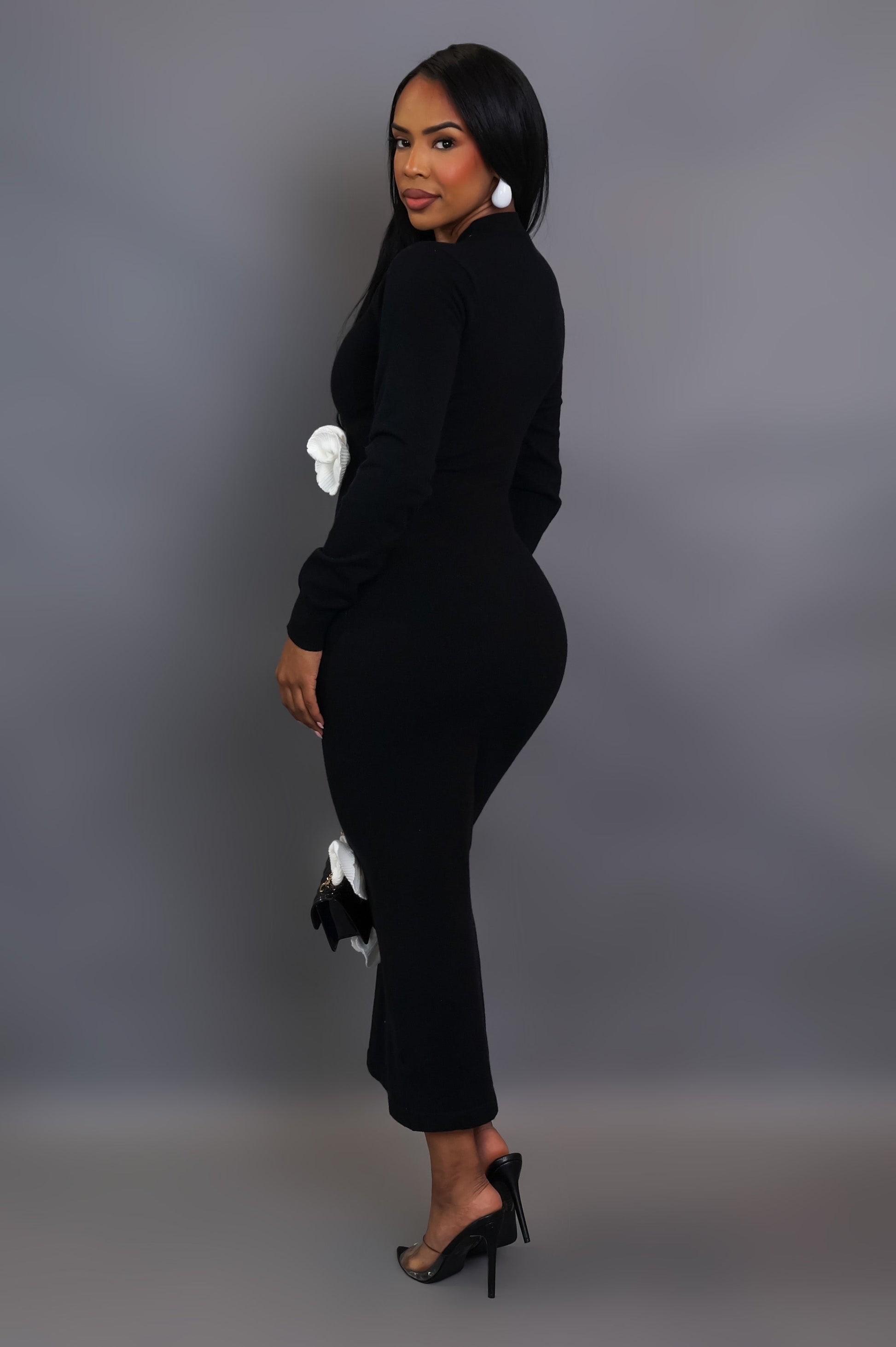 3D White Flower Petal Midi Black Dress