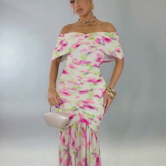 Bouquet of Flowers Off Shoulder Maxi Dress- Pink