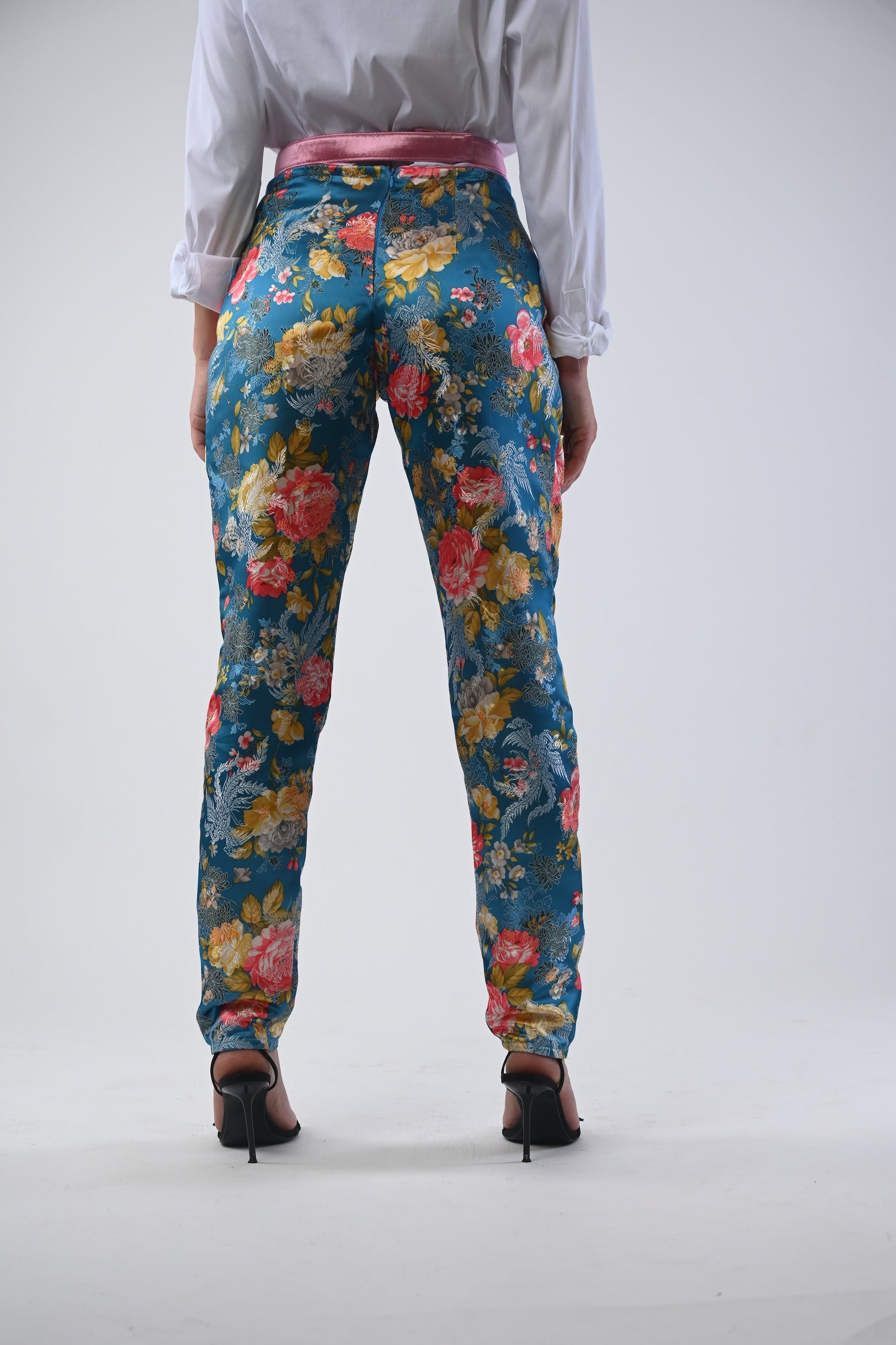 Tailored with a slim fit through the hips and gently tapered toward the ankles, these trousers sculpt a soft, feminine shape while maintaining modern precision. The silk fabric is delicately embroidered with a subtle floral motif, adding depth and texture to the minimalist cut.