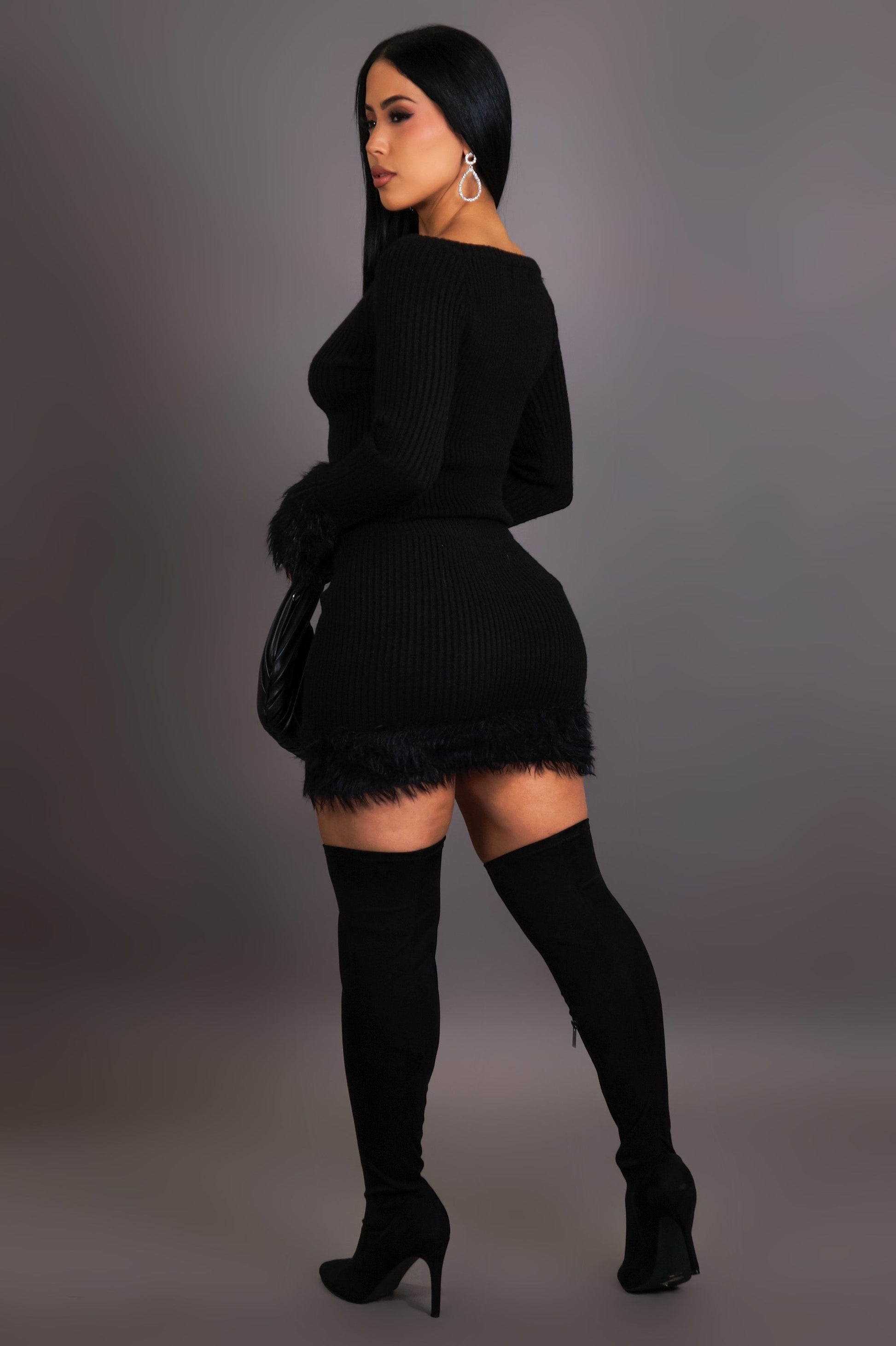 Stay cozy and stylish with this ribbed sweater mini skirt set. The fur trim hem adds glam to this classic piece.