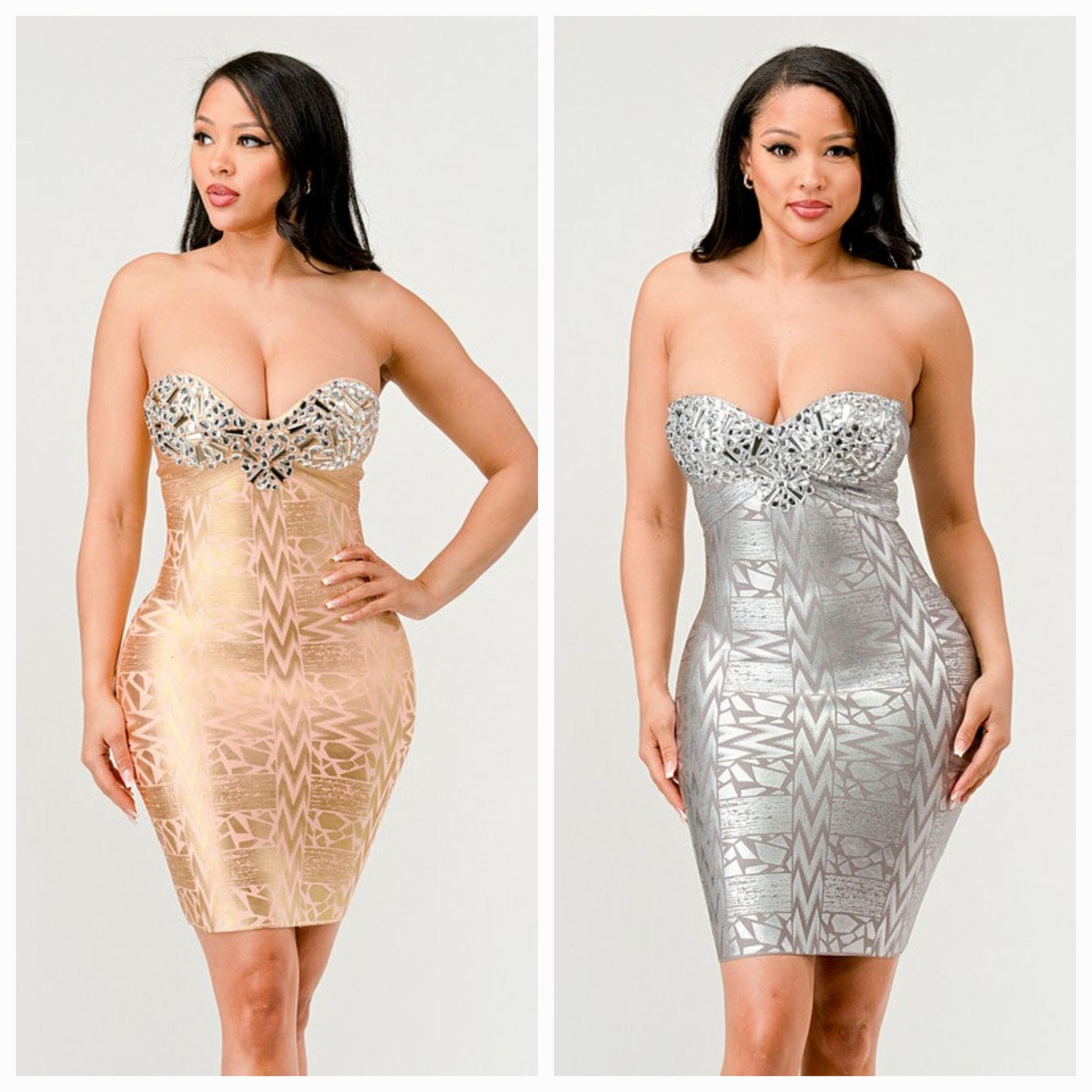 Introducing the "Gilded Glamour Strapless Dress," a stunning display of elegance and contemporary design. The strapless sweetheart neckline gracefully accentuates the shoulders, offering a tasteful hint of allure. Adorned with radiant silver embellishments, the bodice shines with an array of carefully placed beads and sequins that mimic the intricate patterns of baroque artistry, yet with a distinctly modern flair. The fabric, in a muted champagne shade, glimmers subtly, complementing the body's natural curves with its form-fitting silhouette.