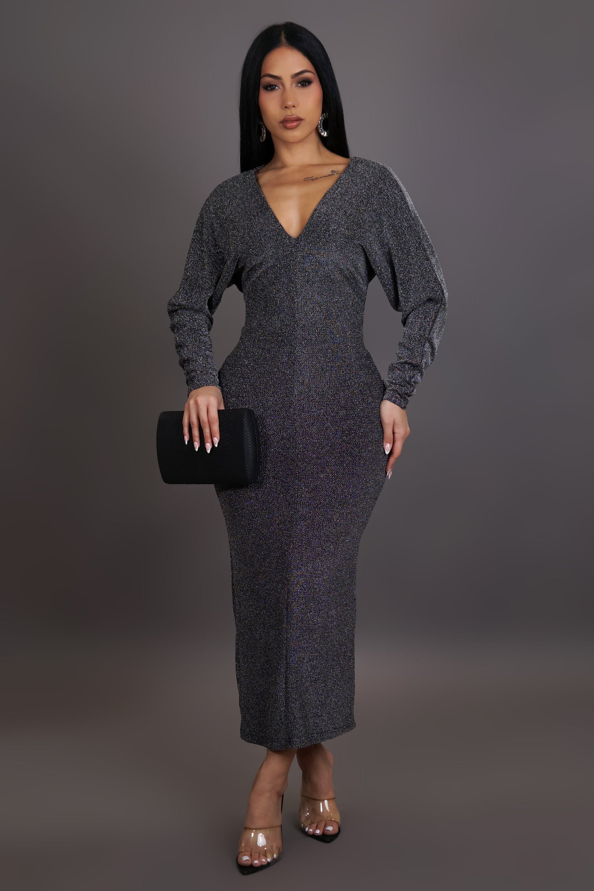 You Will Shimmer And Shine In This Dress. It Is Made From A Glitter Knit Fabric For A Dazzling Look And Comes With A Deep V-Neck And Batwing-Inspired Long Sleeves. The Hip-Hugging Fit Enhances Your Curves, While A Strappy Open Back Lends A Sultry Look.