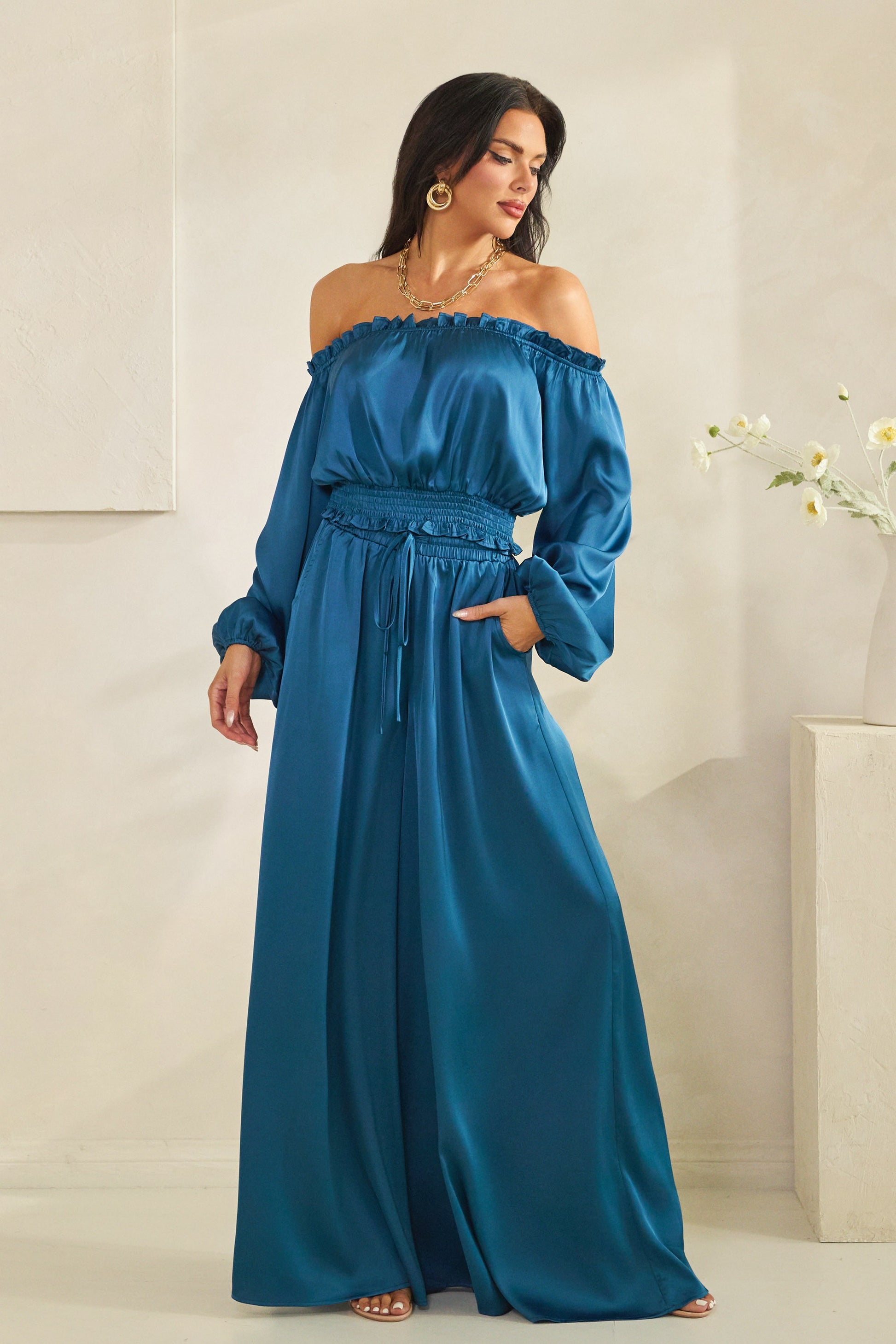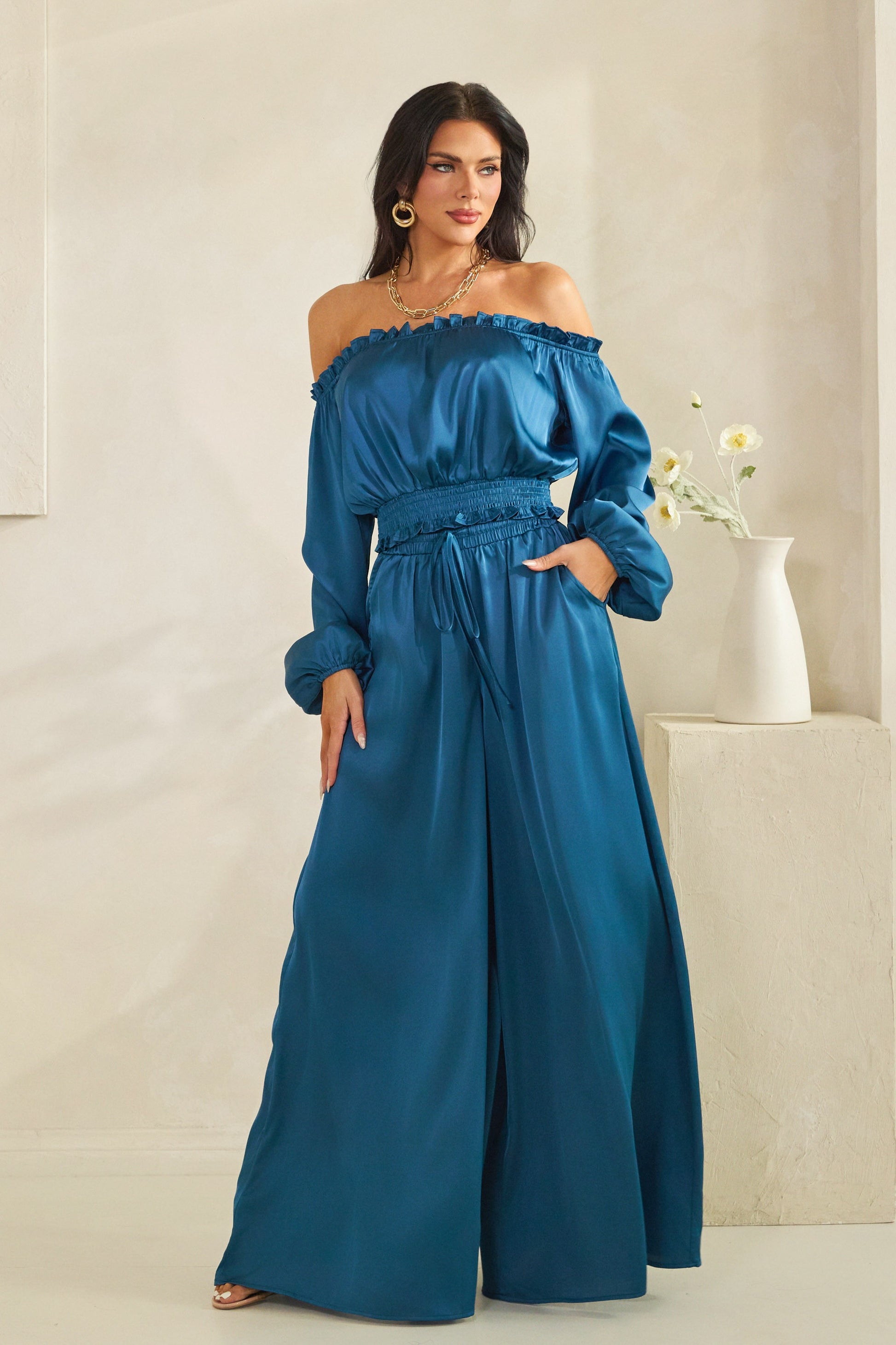 Solid Satin Off Shoulder Lsv Top W/Palazzo Pants Set-Blue