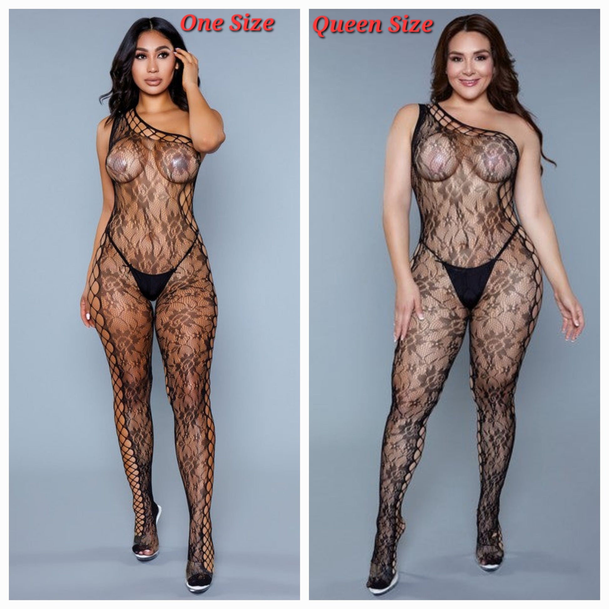 A Captivating one-shoulder bodystocking that blends the boldness of fishnets with the softness of floral lace for a daring yet feminine look.