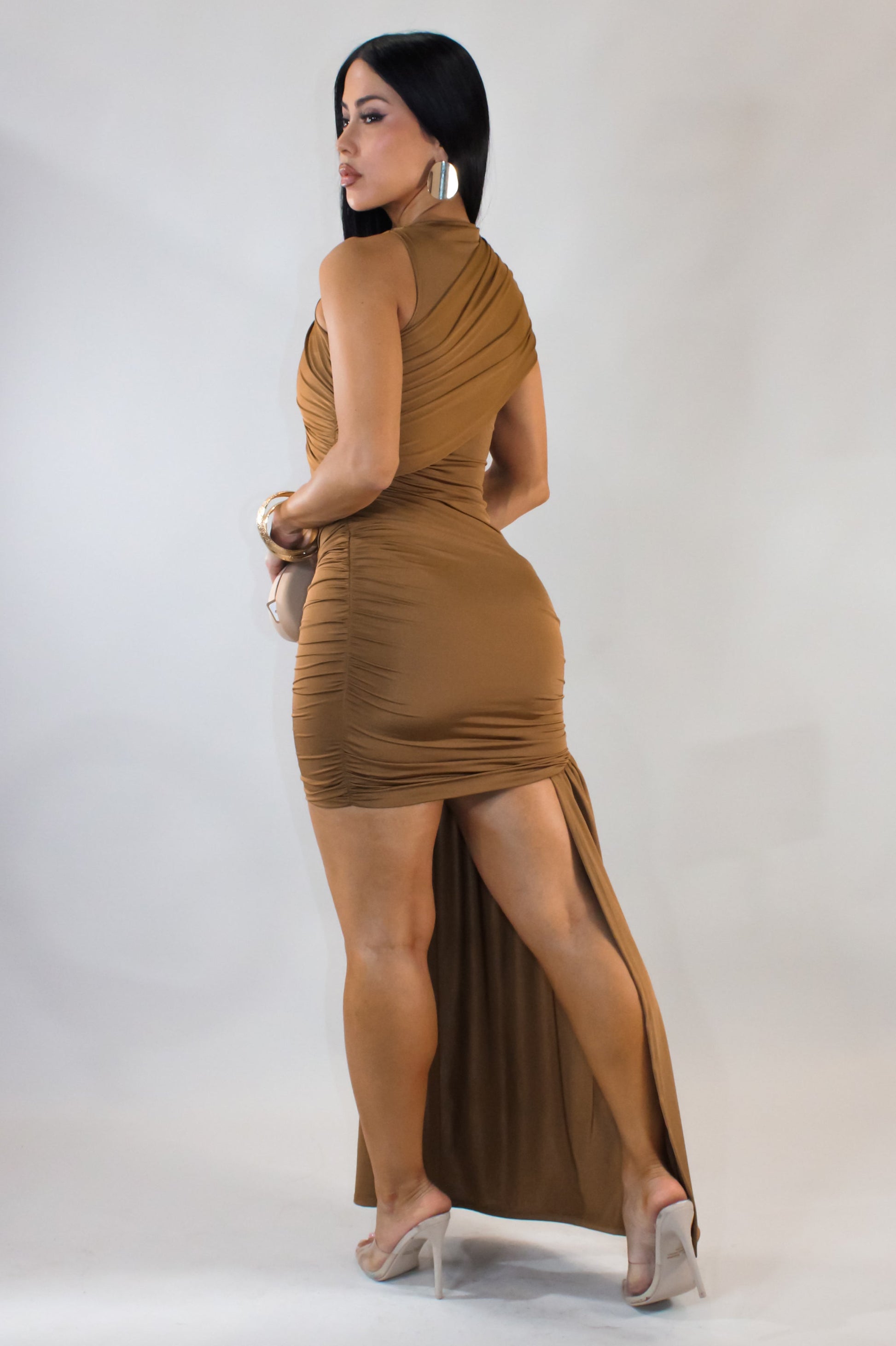 Let's Do the Twist Ruched Draped Mini Dress- Brown