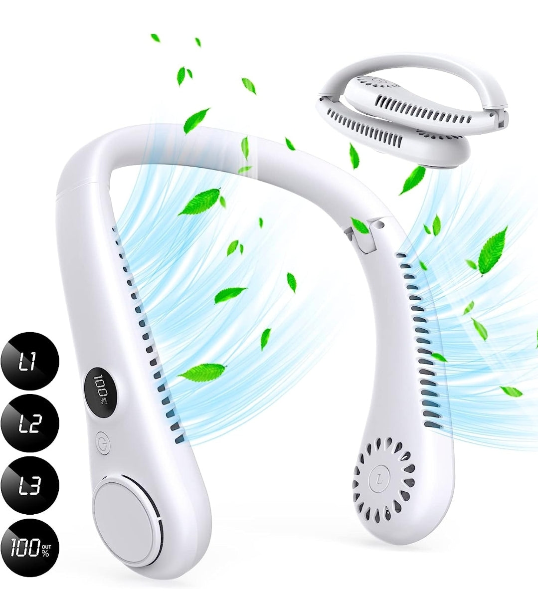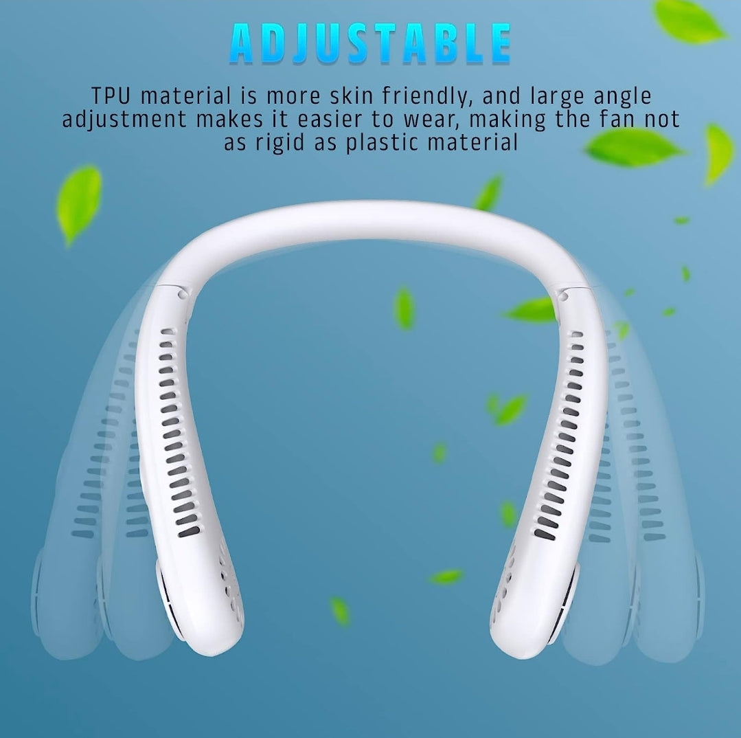 360 Degree Surround Airflow: The neck fan has 360 degree Airflow, won't miss anyplace in your neck, with two speed adjustment, you can adjust the suitable fan speed by pressing the power button repeatedly