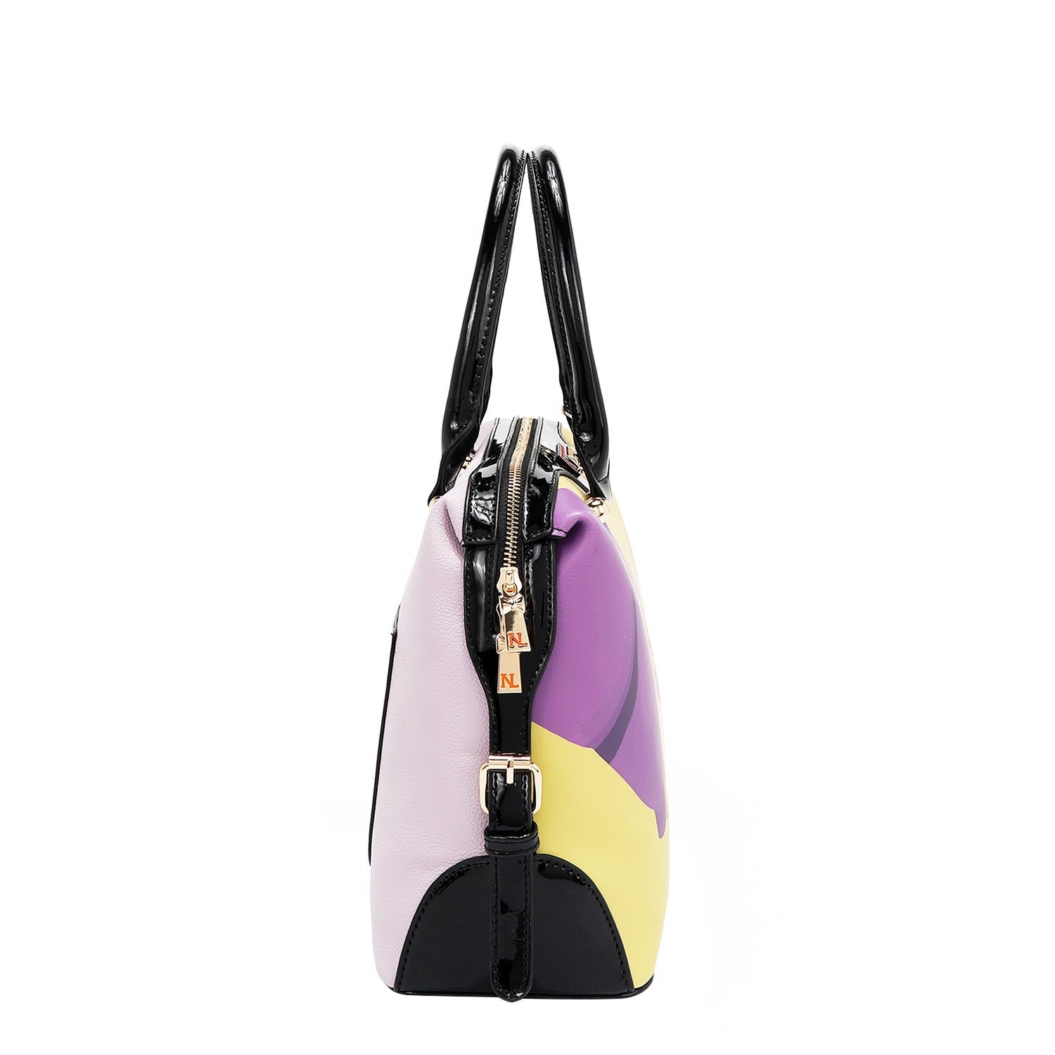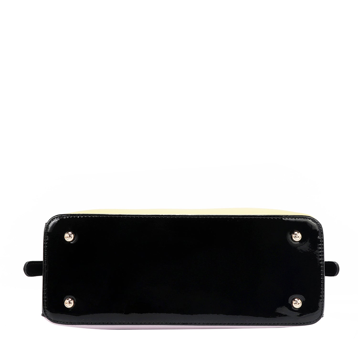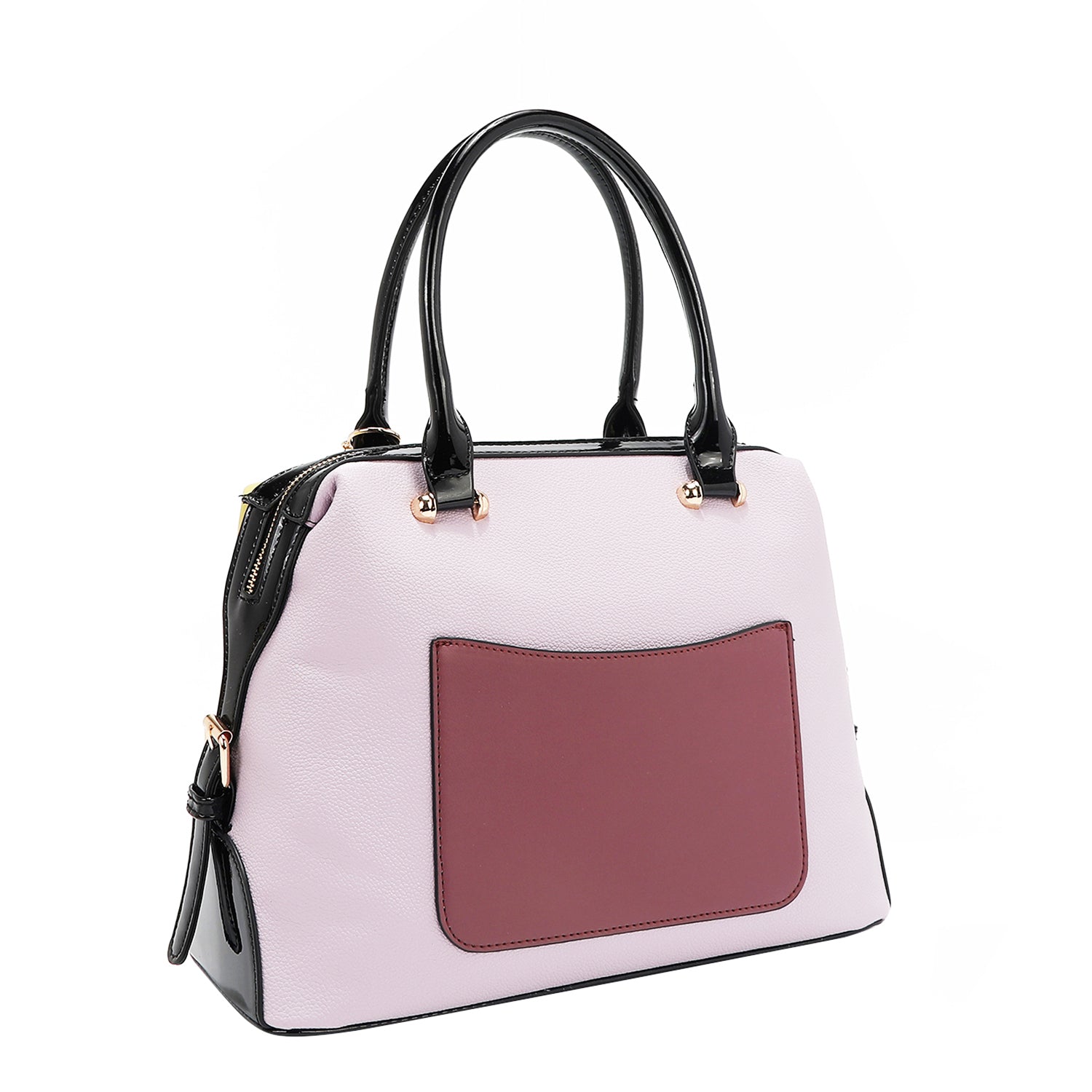 Vegan leather exterior with glossy patent leather accents