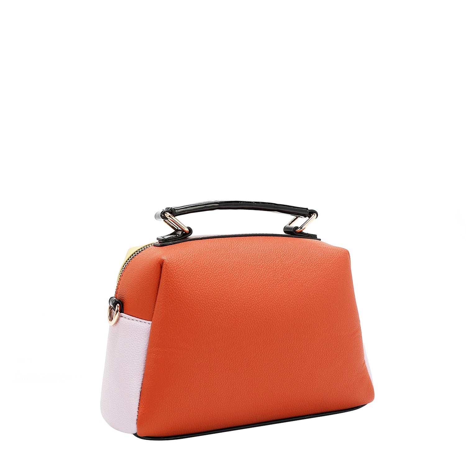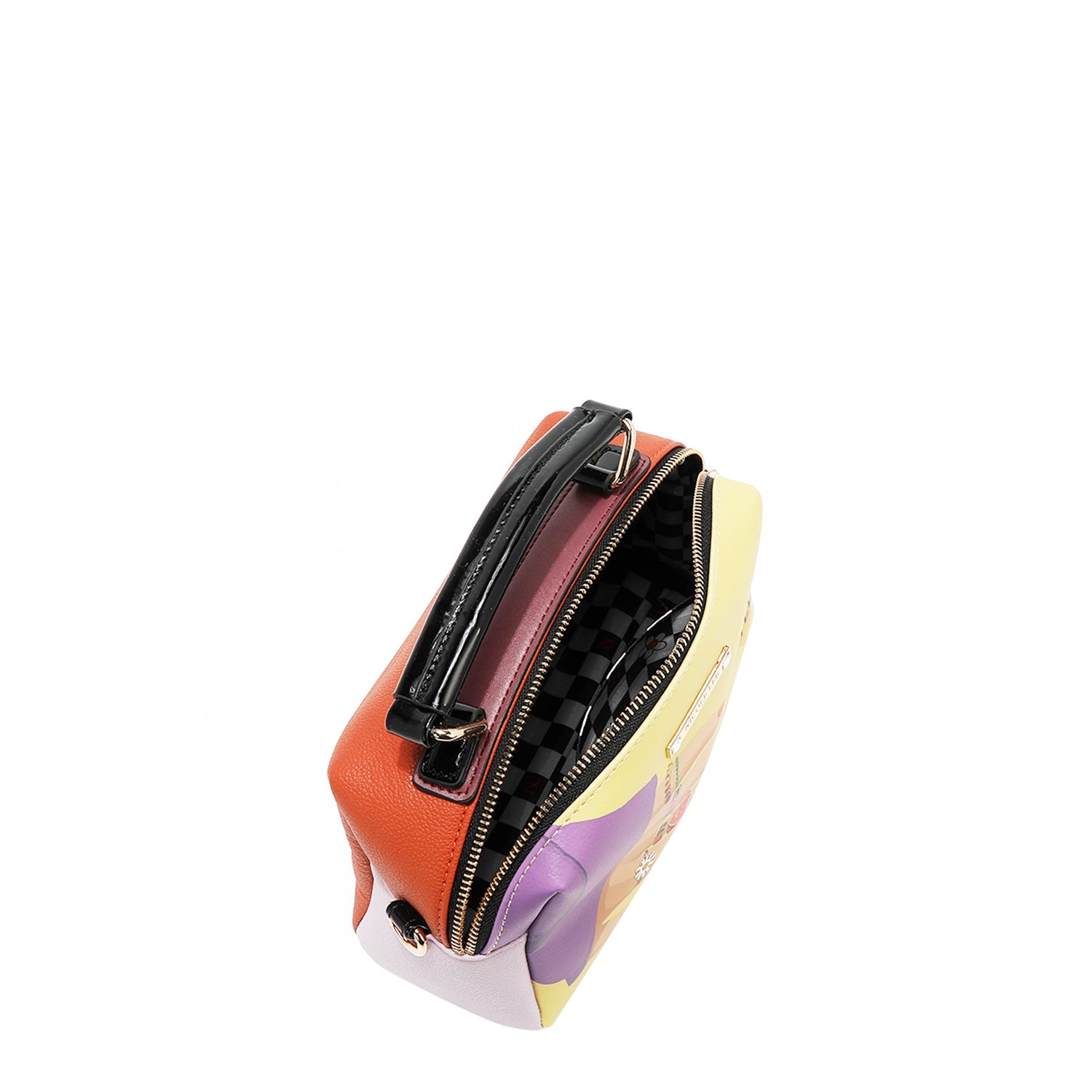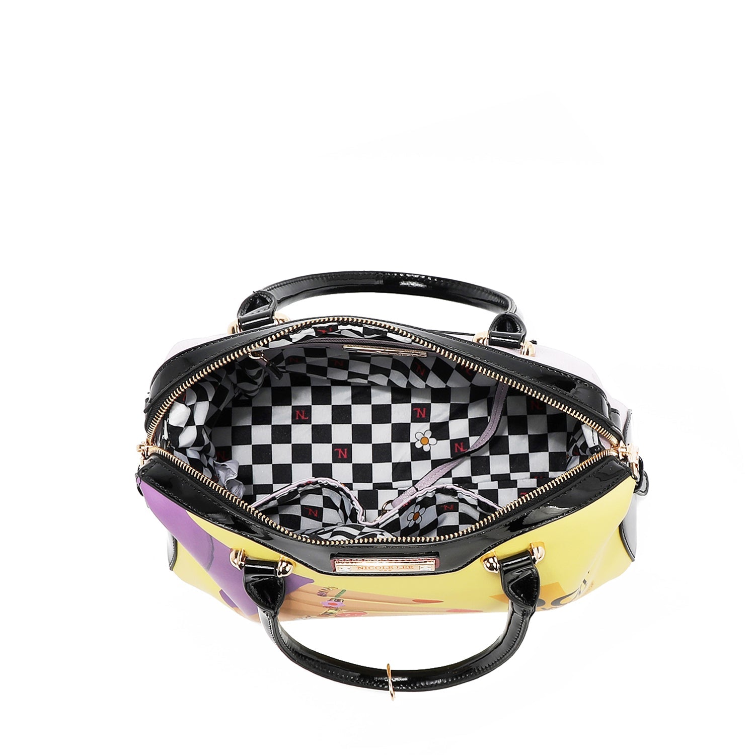 Vegan leather exterior with glossy patent leather accents