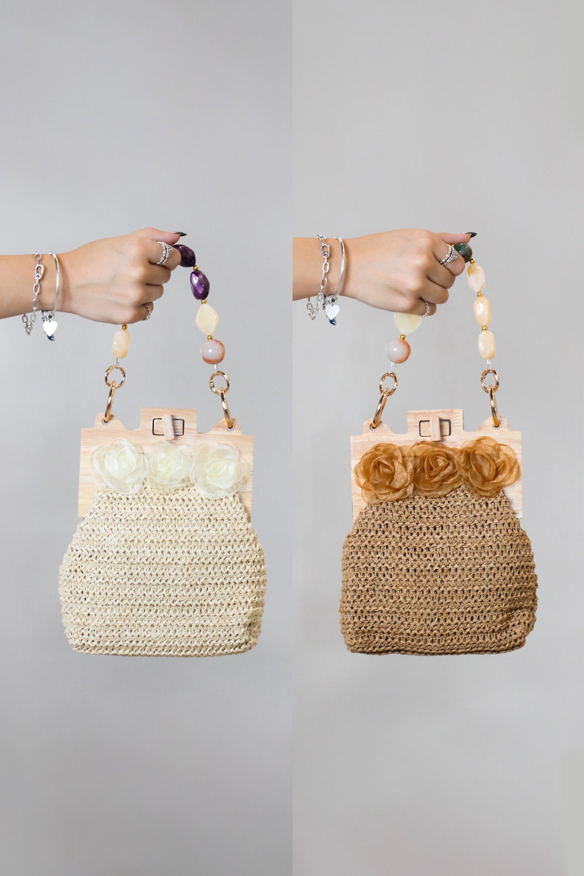 Elevate your summer style with our exquisite straw bag adorned with a charming flower accent.