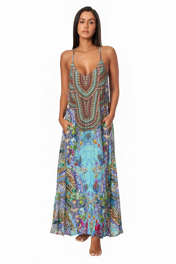 Buy Poppy Garden Racerback Maxi Dress for Resort or Cruise. This lovely garment features a V-neck, spaghetti straps, loose flare bodice, sleeveless, made with super light tropical printed material, comes with inseam pockets. Ideal for summer wear, bohemian casual style. Look and feel like a goddess in any setting while wearing this lovely flattering dress! The relaxed fit and flattering silhouette can easily be paired with everything from slouchy sweaters to tailored boleros or jackets
