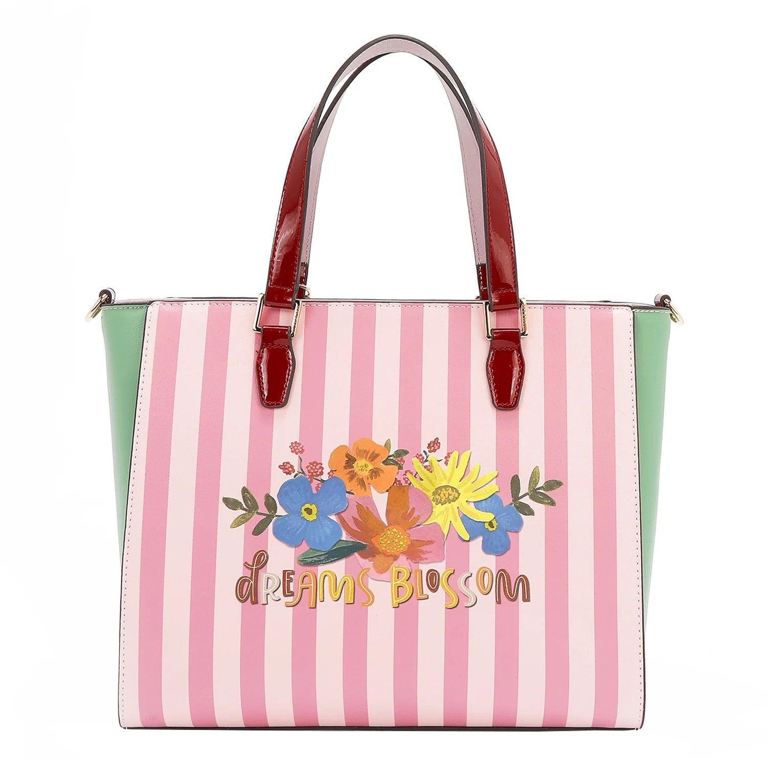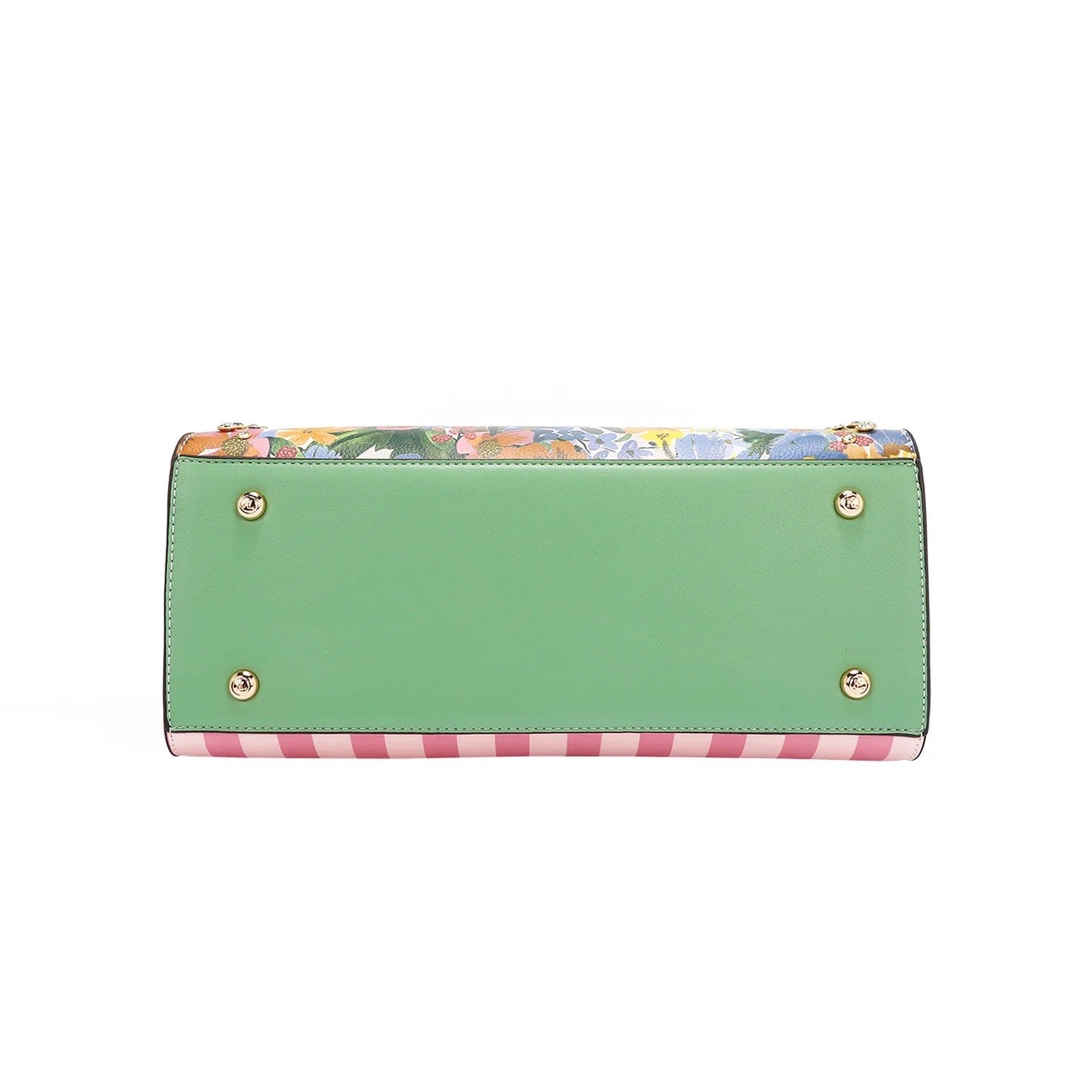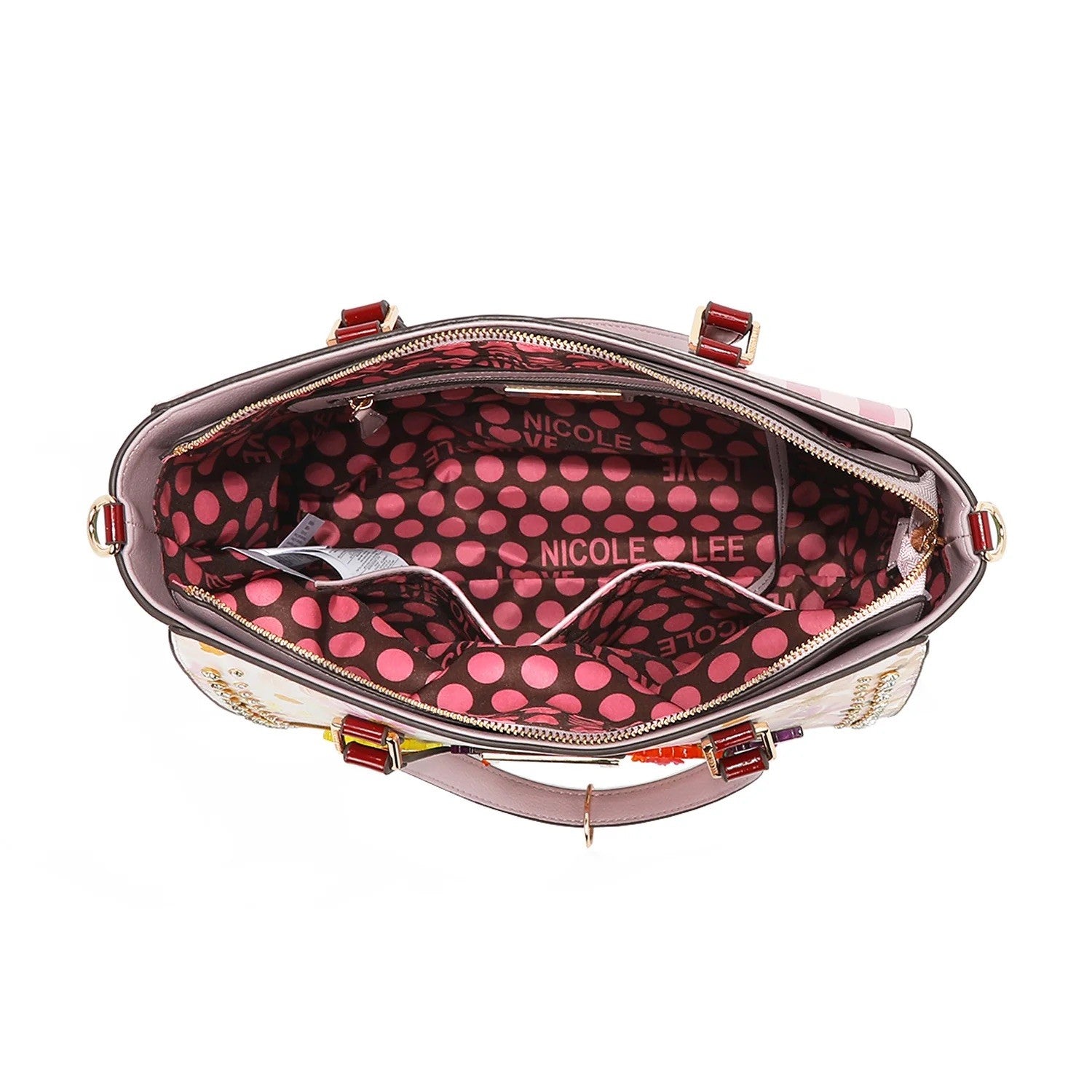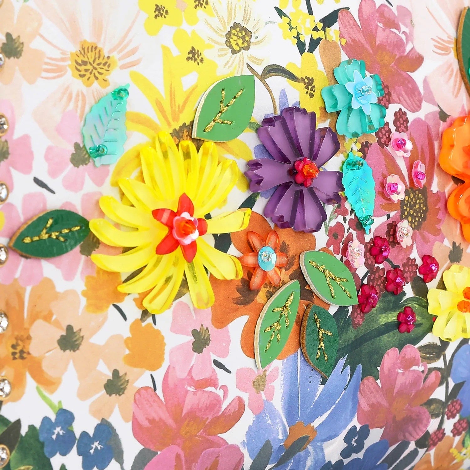 Front is embellished with resin flowers, sequins, beads, and appliques