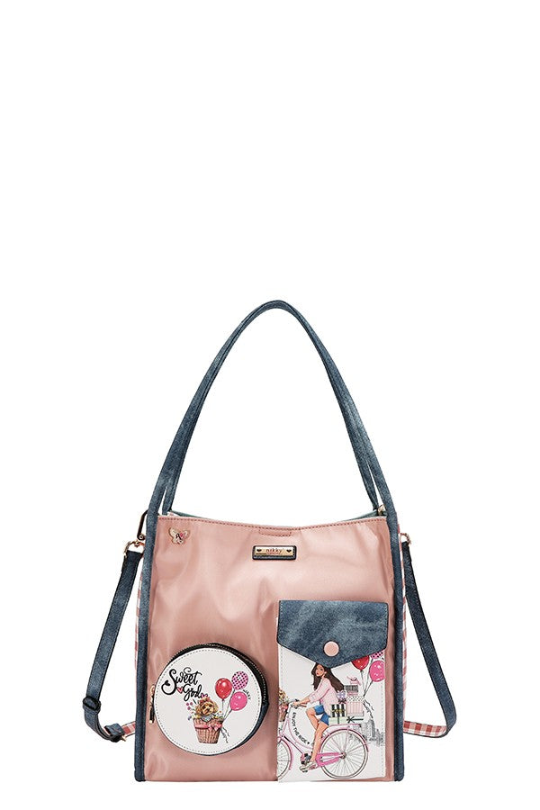 The Sweet Girl 2 Piece Shoulder Bag set is the perfect blend of style and everyday convenience. A charming city-story print featuring a girl on her bicycle with balloons, gifts,
