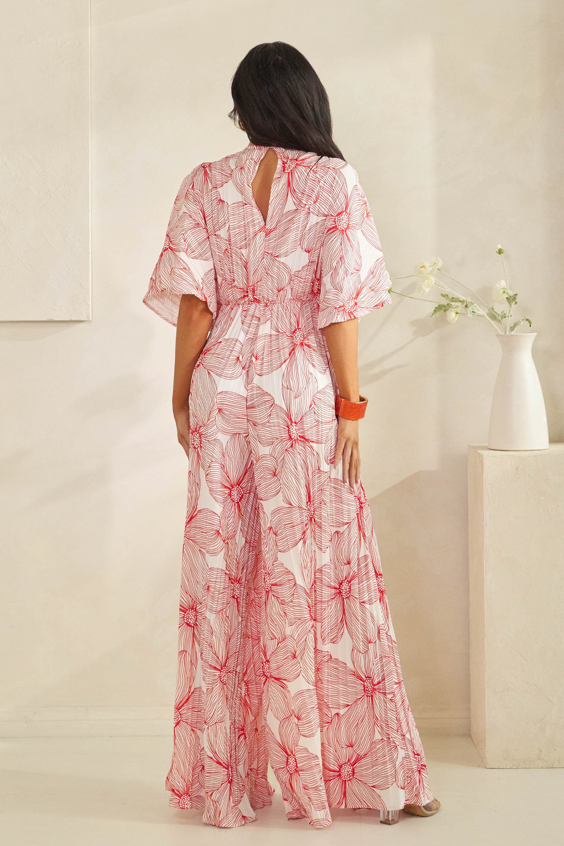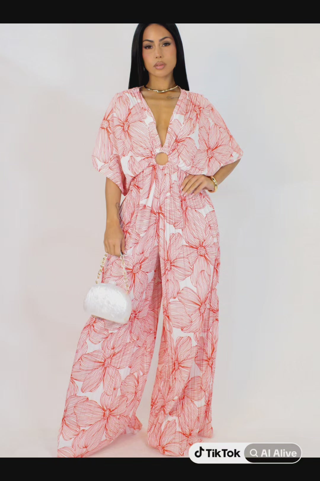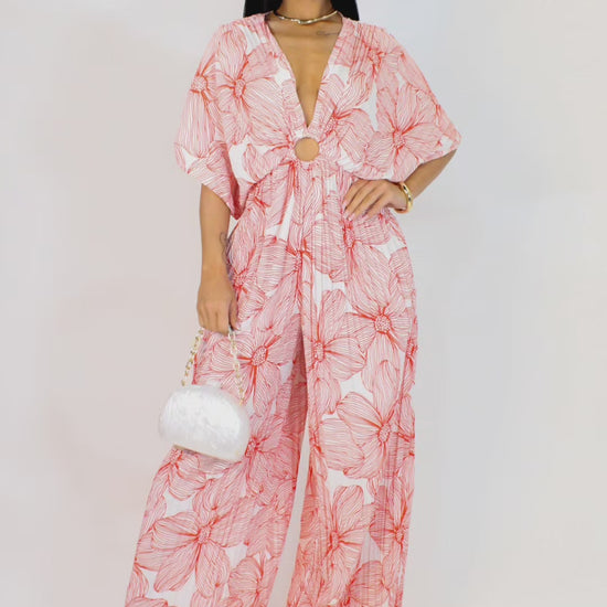 V-neck Drop Shoulder W/ O-ring Pleated Jumpsuit- Orangish-Red
